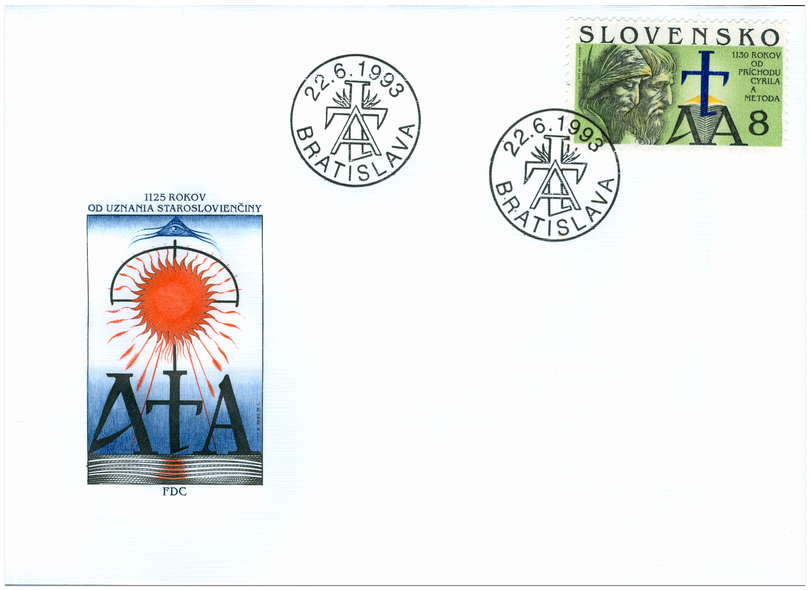 Ministerstvo dopravy, spojov a verejných prác SR vydalo dňa 22.6.1993 spoločne s Českou republikou príležitostnú poštovú známku "1130 rokov od príchodu Cyrila a Metoda" s nominálnou hodnotou 8 Sk. Spoločné vydanie sa odlišuje v názve vydavateľskej krajiny, v označení meny (slovenská verzia bez udania meny) a jazykovými mutáciami textu. Autorom výtvarného návrhu známky je akad. maliar Igor Benca, rytinu spracoval Martin Srb. Námetom známky je dvojportrét pripomínajúci Cyrila a Metoda a kompozícia počiatočných písmen hlaholiky, cyriliky a latinky s otvorenou knihou ako symbolu vývoja písma a vzdelanosti. Známky rozmerov 40x23 mm na šírku vytlačila Poštová tlačiareň cenín Praha a.s. rotačnou oceľotlačou...
