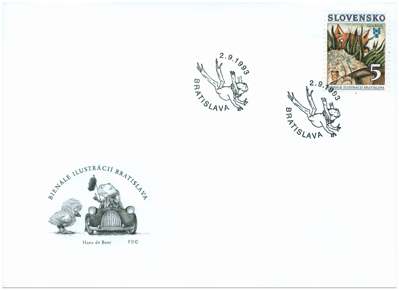 Ministerstvo dopravy, spojov a verejných prác Slovenskej republiky vydalo dňa 2.9.l993 príležitostnú poštovú známku "Bienále ilustrácií Bratislava" s nominálnou hodnotou 5 Sk. Na známke je zreprodukovaná ilustrácia výtvarníka Lane Smitha z publikácie " The Big Pets" ( vydavateľstvo Viking, New York 1991). Ilustrácie boli ocenené Zlatým jablkom BIB '91. Autorom grafickej úpravy známky je Ľubomír Krátky, autorom ryteckej rozkresby a rytiny je akademický maliar Rudo Cigánik. Známku veľkosti 23x30 mm vytlačila Poštová tlačiareň cenín, Praha, a.s. rotačnou oceľotlačou v kombinácii s hĺbkotlačou, viacfarebne, na tlačových listoch po 50 kusoch. Známka platí v tuzemskom i medzinárodnom styku od 2.9.1993 až do odvolania...