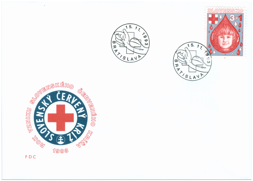 Ministerstvo dopravy, spojov a verejných prác SR vydalo dňa 15. 11. 1993 príležitostnú príplatkovú poštovú známku "Červený kríž" v nominálnej hodnote 3 Sk s príplatkom 1 Sk v prospech Slovenského Červeného kríža. Autorom výtvarného návrhu známky, FDC a pečiatky a súčasne aj rytcom je František Horniak. Obrazovú časť známky tvorí symbolická kresba kvapky krvi s detskou tváričkou, dopĺňa ju znak Červeného kríža. Známku o rozmeroch 23 x 30 mm vytlačila Poštová tlačiareň cenín, Praha, a.s. rotačnou oceľotlačou kombinovanou s hĺbkotlačou na tlačových listoch po 50 kusoch. Známka platí v tuzemskom a medzinárodnom poštovom styku od 15. 11. 1993 až do odvolania...