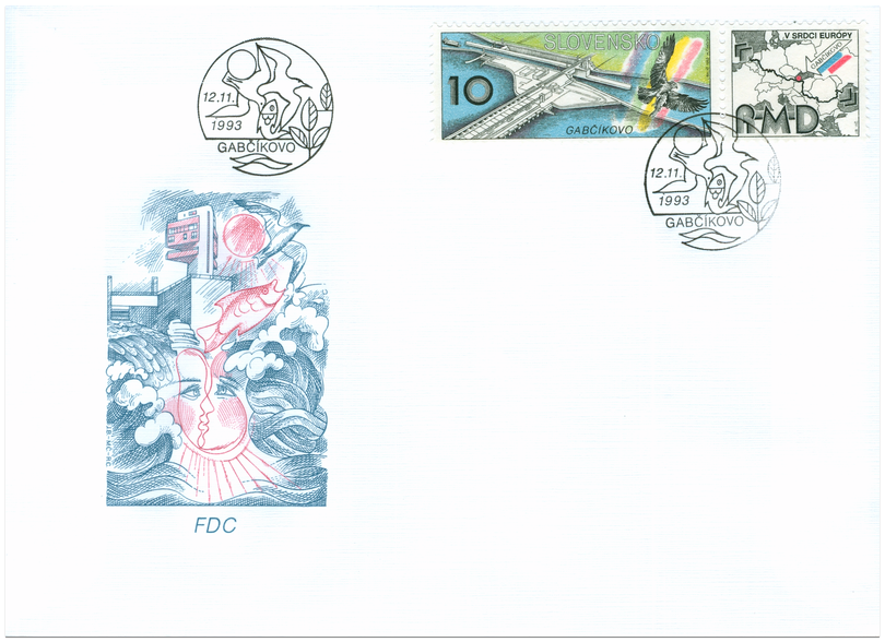 Ministerstvo dopravy, spojov a verejných prác Slovenskej republiky vydalo dňa 12. 11. 1993 príležitostnú poštovú známku "Gabčíkovo" v nominálnej hodnote 10 Sk. Na známke je zobrazené vodné dielo Gabčíkovo, nad vodnou hladinou sa vznáša kršiak rybár s korisťou, v pozadí sa črtá dúha. Viacfarebná známka rozmerov 49 x 19 mm je doplnená kupónom modrej farby rozmerov 23 x 19 mm. Na kupóne je mapka vodnej cesty Rýn - Mohan - Dunaj (R-M-D) s vyznačením Gabčíkova a s textom "V srdci Európy". Autorom výtvarného návrhu známky a kupónu je akad. maliar Jozef Baláž, rytcom je akad. maliar Martin Činovský. Emisiu vytlačila Poštová...
