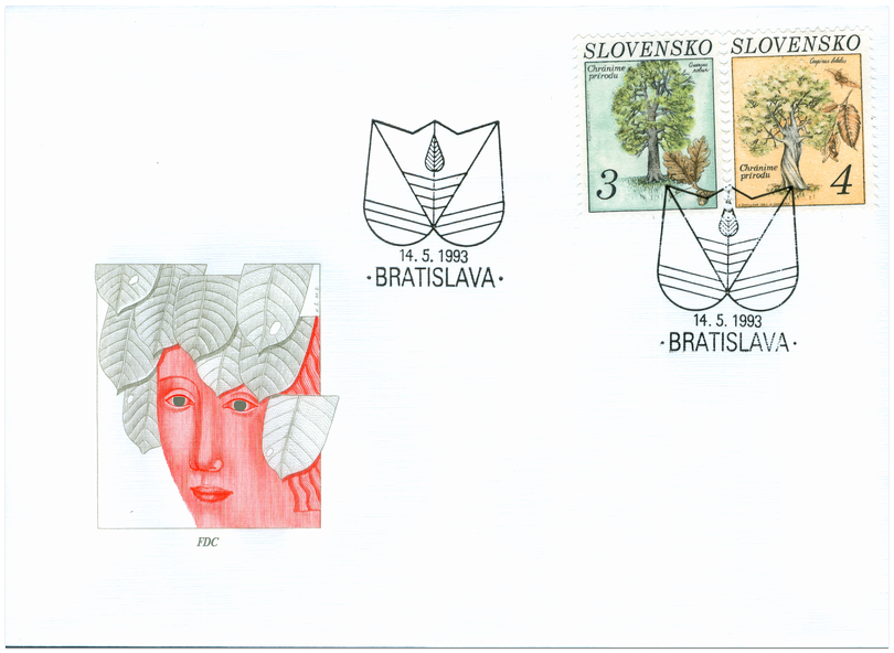 Ministerstvo dopravy, spojov a verejných prác SR vydalo dňa 14.5.1993 tri príležitostné známky v sérii "Ochrana prírody": 3 Sk - Dub letný (Quercus robur) - farba zelenomodrá, žltozelená, šedohnedá, hnedá a čierna 4 Sk - Hrab obyčajný (Carpinus betulus) - farba okrová, hnedá, zelená, šedá a čierna 10 Sk - Borovica sosna (Pinus silvestris) - farba modrá, hnedá, zelená, červená a čierna Autorom výtvarných návrhov emisie je Katarína Ševellová a autorom rytiny je Miloš Ondráček. Známky rozmerov obrazovaj časti 23x30 mm na výšku vytlačila Poštová tlačiareň cenín a.s. v Prahe rotačnou oceľotlačou v kombinácii s hĺbkotlačou na tlačových listoch po 50...