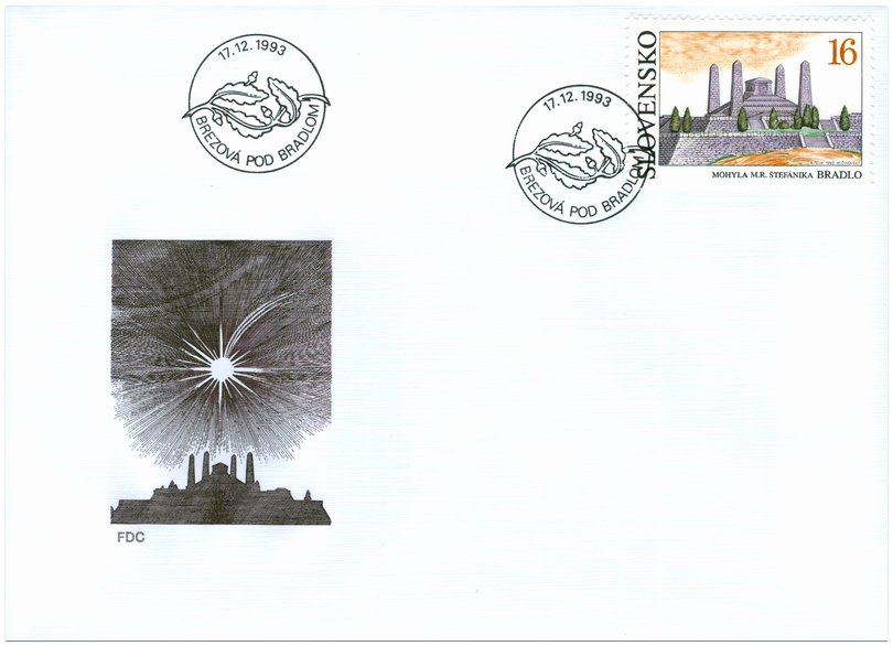 Ministerstvo dopravy, spojov a verejných prác Slovenskej republiky vydalo dňa 17. 12. 1993 príležitostnú poštovú známku "Mohyla M. R. Štefánika Bradlo" v nominálnej hodnote 16 Sk. Viacfarebná známka rozmerov obrazovej časti 40 x 26 mm je vytlačená na poštovom hárčeku rozmerov 70 x 90 mm. Na známke je stavba mohyly realizovaná podľa projektu architekta Dušana Jurkoviča. V dolnej časti hárčeka je zobrazený pohľad na krajinu. Autorom výtvarných návrhov emisie je akad. maliar Karol Felix. Rytcom známky je akad. maliar Martin Činovský. Sprievodný motív na hárčeku vyryl František Horniak. Hárček vytlačila PTC, a. s. Praha oceľotlačou z plochých platní. Známka platí v...