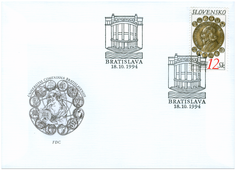 Ministerstvo dopravy, spojov a verejných prác vydalo dňa 18.10.1994 príležitostnú poštovú známku "75 rokov Univerzity Komenského" v nominálnej hodnote 12 Sk. Dvojfarebná známka (zlatistá a čierna farba) s vyobrazením averzu univerzitnej medaily (autor O. Španiel), symbolmi jednotlivých fakúlt a latinskými nápismi je dielom akad. maliara Dušana Kállaya. Rytinu známky vytvoril Martin Srb. Známku rozmerov obrazovej časti 23 x 40 mm (na výšku) vytlačila Poštovní tiskárna cenin, a.s., Praha technikou rotačnej oceľotlače v kombinácii s hĺbkotlačou na tlačových listoch po 50 ks v náklade 2 000 000 ks. Základ založenia Univerzity Komenského v Bratislave vytvorilo v roku 1919 Národné zhromaždenie ČSR. V...