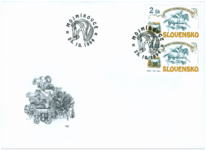 Ministerstvo dopravy, spojov a verejných prác vydalo 25.10.1994 príležitostnú poštovú známku "Dostihy v Mojmírovciach" v nominálnej hodnote 2 Sk. Známka bola vydaná pri príležitosti 180. výročia jedného z najstarších dostihov v Európe. Nápis na známke uvádza deň konania 1. ročníka dostihov v Mojmírovciach - 19.5.1814. Okrem koňa s pretekárom je na známke zobrazený aj najúspešnejší kôň z chovu v Mojmírovciach - Tajár (1811-1830), ktorý prvý ročník vyhral. Výtvarníkom emisie je akad. maliar Dušan Grečner. Rytcom je akad. maliar Rudolf Cigánik. Známku s tmavou kresbou na okrovej podtlači o rozmeroch obrazovej časti 40 x 23 mm na šírku, vytlačila Poštovní tiskárna cenin...