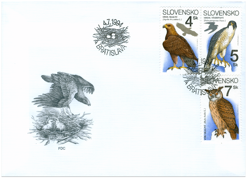 Ministerstvo dopravy, spojov a verejných prác vydalo dňa 4. 7. 1994 tri príležitostné poštové známky v sérii "Ochrana prírody": 4 Sk - orol skalný (Aquila chrysaetus L.) 5 Sk - sokol sťahovavý (Falco peregrinus Tunst.) 7 Sk - výr skalný (Bubo bubo L.) Autorom výtvarných návrhov emisie je akad. maliar Ján Švec, autorom rytín je akad. maliar Rudolf Cigánik. Viacfarebné známky, rozmerov obrazovej časti 23 x 40 mm, na výšku, vytlačila Poštovní tiskárna cenin, a. s., Praha rotačnou oceľotlačou v kombinácii s hĺbkotlačou na tlačových listoch po 50 ks v náklade po 5 000 000 ks. Dravec orol skalný dnes sa...