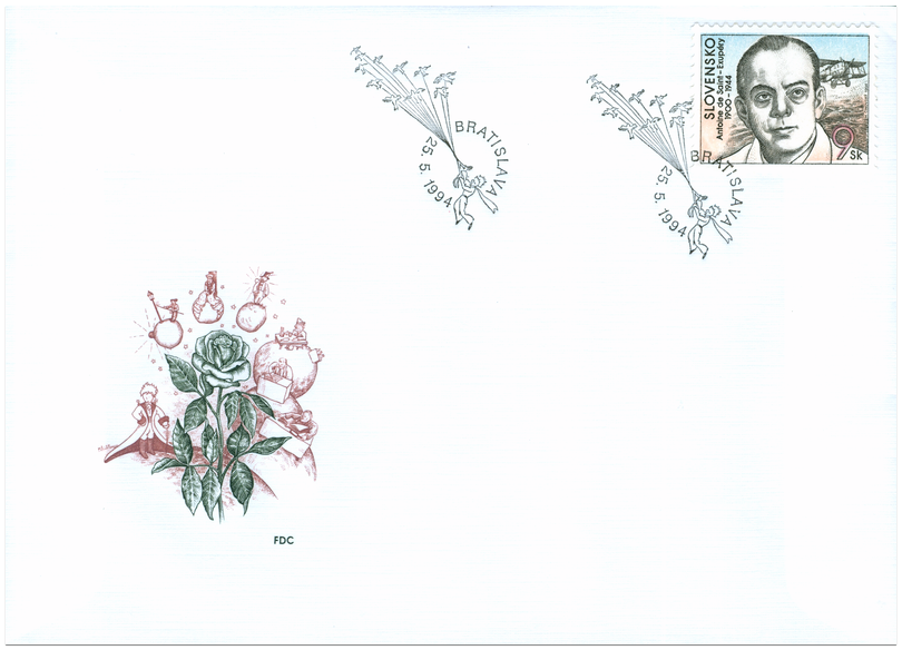 Ministerstvo dopravy, spojov a verejných prác SR vydalo dňa 25. 5. 1994 príležitostnú poštovú známku "Antoine de Saint-Exupéry", zo série Osobnosti, o nominálej hodnote 9 Sk. Známka s portrétom tohto významného spisovateľa a známeho letca a s vyobrazením lietadla v pozadí je autorsky aj rytecky dielom akademického maliara Martina Činovského. Dvojfarebnú známku o rozmeroch obrazovej časti 23 x 30 mm na šírku vytlačila PTC, Praha, a.s. rotačnou oceľotlačou v kombinácii s hĺbkotlačou v tlačových listoch po 50 ks v náklade 5 000 000 ks. Antoine de Saint-Exupéry (29.6.1900 Lyon - 31.6. 1944) - francúzsky spisovateľ a letec, ktorý sa stratil v...