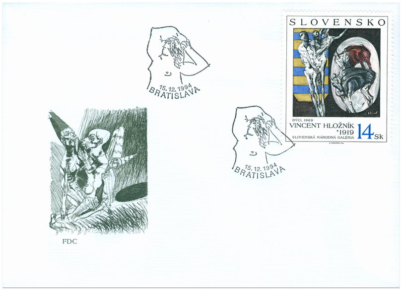 Ministerstvo dopravy, spojov a verejných prác vydalo dňa 15.12.1994 príležitostnú poštovú známku "Vincent Hložník: Býci", zo série Umenie, v nominálnej hodnote 14 Sk. Na známke pod reprodukciou diela okrem uvedenia nominálnej hodnoty sú texty: Býci, 1969, Vincent Hložník, 1919, Slovenská národná galéria. Autorom grafickej úpravy je akad. maliar Martin Činovský. Autorom rytín emisie je M. Ondráček. Viacfarebnú známku rozmerov obrazovej časti 40 x 50 mm,na výšku, vytlačila PTC, a.s., Praha 5-farebnou oceľotlačou z plochých platní na tlačových listoch po 4 ks. Celkovo bolo vytlačených 400 000 ks. Vincent Hložník - národný umelec, vysokoškolský profesor, maliar, grafik, ilustrátor, pedagóg. Narodil sa 22...