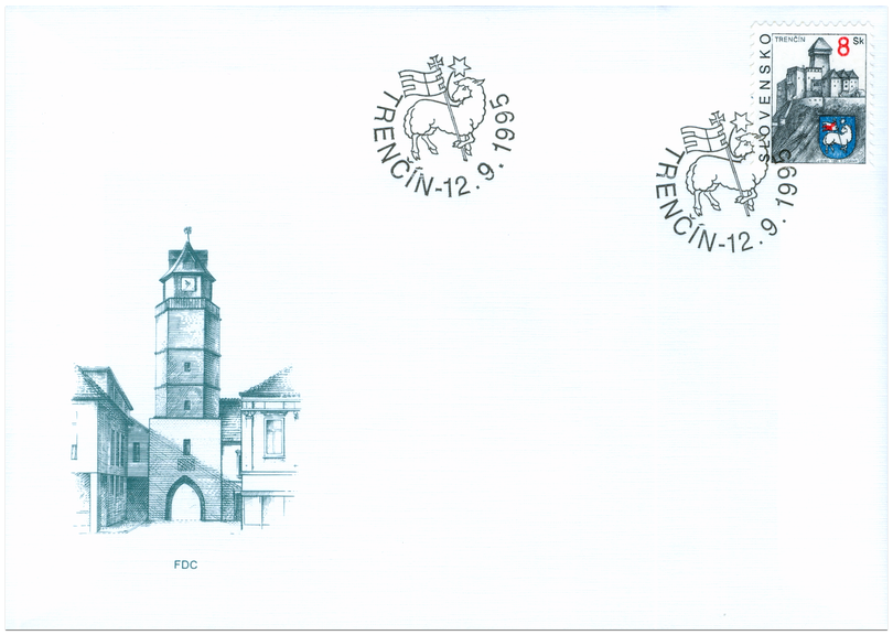 Ministerstvo dopravy, pôšt a telekomunikácií vydalo dňa 12. 9. 1995 výplatnú poštovú známku "Trenčín" v nominálnej hodnote 8 Sk. V hornej časti známky je zobrazený Trenčiansky hrad (oceľovomodrá farba), vpravo hore nominálna hodnota (červená farba), v pravej dolnej časti je mestský erb (v modrom poli biely baránok s červeno-bielou zástavou). Starobylý Trenčín spolu s Trenčianskym hradom - národnou kultúrnou pamiatkou dokumentuje významné kapitoly našich národných dejín. Výhodná zemepisná poloha na skale, ktorá sa vypína nad Váhom a na križovatke starých obchodných ciest určila charakter osídlenia od najstarších čias. Teritórium dnešného Trenčína bolo významné v období rímskej expanzie. Rímske vojsko vtedy preniklo...