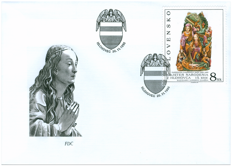 Ministerstvo dopravy, pôšt a telekomunikácií vydalo dňa 30. 11. 1995 príležitostnú poštovú známku "Narodenie z Hlohovca", zo série Umenie, o nominálnej hodnote 8 Sk. Na známke pod reprodukciou diela okrem nominálnej hodnoty sú texty: Majster Narodenia z Hlohovca, 15. stor., Narodenie z Hlohovca, okolo 1485-1490, Slovenská národná galéria. Podľa štylistických znakov patrí reliéf Narodenie z Hlohovca do okruhu hornorýnsky orientovaného sochárstva. Predstavuje typ Adorácie narodenia Ježiška, v ktorom Panna Mária kľačí pred dieťatkom so zloženými rukami. Dieťa leží na cípe plášťa pridržiavanom anjelmi. Kompozícia dodržiava stredovekú hierarchiu jednotlivých postáv. Z umeleckého hľadiska sa vyznačuje elegantnou a kultivovanou formou a lyricky precíteným...