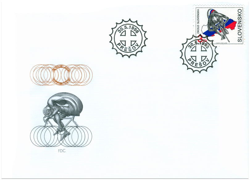 Ministerstvo dopravy, pôšt a telekomunikácií vydalo dňa 30. 5.1996 príležitostnú poštovú známku "Okolo Slovenska" o nominálnej hodnote 3 Sk. Známka zobrazuje pretekára - cyklistu na pozadí obrysu Slovenska vo farbách slovenskej trikolóry. Autorom výtvarných návrhov emisie je akad. maliar Robert Brun. Rytcom emisie je Martin Srb. Viacfarebnú známku o rozmeroch obrazovej časti 30 x 23 mm (na šírku) vytlačila Poštovní tiskárna cenin, a.s., Praha technikou rotačnej oceľotlače v kombinácii s hĺbkotlačou na tlačových listoch po 50 ks. V roku 1996 sa organizoval už 40. ročník medzinárodných cyklistických pretekov OKOLO SLOVENSKA, ktoré si za uplynulé obdobie získali veľmi dobré meno vo svetovej...