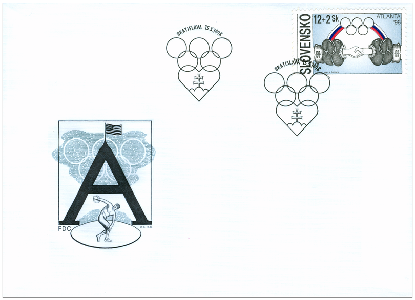 Ministerstvo dopravy, pôšt a telekomunikácií vydalo dňa 15.5.1996 príležitostnú poštovú známku "Olympijské hry Atlanta '96" o nominálnej hodnote 12 Sk + príplatok 2 Sk v prospech Slovenského olympijského výboru. Viacfarebná známka o rozmeroch obrazovej časti 40 x 23 mm (na šírku) je spolu s obrazovým motívom medzihárčia vytlačená na hárčeku formátu 66 x 80 mm. Symbolická kresba známky (podanie rúk cez boxerské rukavice, dúha vo farbách slovenskej trikolóry a olympijské kruhy) je doplnená na medzihárčí čiernobielym motívom plachetnice plaviacej sa k Atlante. Hárček vytlačila Poštovní tiskárna cenin, a.s., Praha technikou rotačnej oceľotlače v kombinácii s hĺbkotlačou. Autorom výtvarných návrhov emisie je...