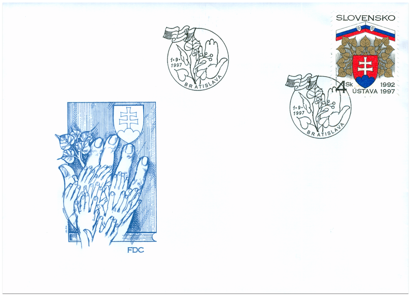 Ministerstvo dopravy, pôšt a telekomunikácií SR vydalo dňa 1. 9. 1997 k 5. výročiu prijatia Ústavy SR príležitostnú poštovú známku s nominálnou hodnotou 4 Sk so symbolickou kresbou s použitím štátnych symbolov a lipových ratolestí. Autorom výtvarných návrhov emisie je Jozef Baláž, rytinu známky vytvoril Martin Činovský. Viacfarebnú známku o rozmeroch obrazovej časti 23 x 30 mm (na výšku) vytlačila Poštovní tiskárna cenin, a.s., Praha technikou rotačnej oceľotlače v kombinácii s hĺbkotlačou na tlačových listoch po 50 známkach . Slovenská národná rada ešte počas existencie Českej a Slovenskej Federatívnej republiky schválila 1. septembra 1992 Ústavu Slovenskej republiky, ktorá položila základy zvrchovanému...