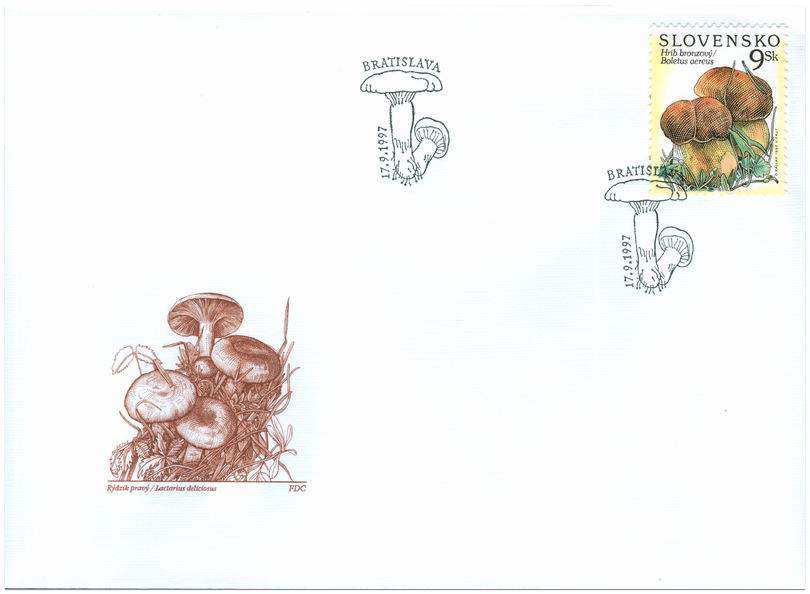 Ministerstvo dopravy, pôšt a telekomunikácií SR vydalo dňa 17. 9. 1997 tri príležitostné poštové známky v nominálnej hodnote po 9 Sk vytlačené na spoločnom hárčeku s námetom huby v sérii Ochrana prírody. Na známkach sú vyobrazené: hríb bronzový, smrčok jedlý a náramkovka cisárska, na medzipolí a okrajoch tlačového listu: mnohokrčka dierkovaná, kyjak useknutý, rôsolovec červený, kozák osikový a kučierka veľká. Autorom výtvarných návrhov emisie je Dušan Kállay, rytcom je Václav Fajt. Viacfarebné známky o rozmeroch obrazovej časti 23 x.30 mm (na výšku) na hárčeku rozmerov 155 x 103 mm vytlačila Poštovní tiskárna cenin, a.s., Praha technikou oceľotlače z plochých platní v...