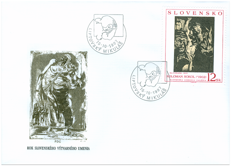 Ministerstvo dopravy, pôšt a telekomunikácií SR vydalo dňa 15. 10. 1997, pri príležitosti Roka slovenského výtvarného umenia,v sérii Umenie, príležitostnú poštovú známku "Koloman Sokol: Za cieľom" s nominálnou hodnotou 12 Sk. Na známke pod vyobrazením diela sú texty "Koloman Sokol (*1902), Za cieľom, 1931, Slovenská národná galéria". Autorom grafickej úpravy emisie je Martin Činovský, rytiny známky a FDC vytvoril Josef Herčík . Známku o rozmeroch obrazovej časti 40 x 50 mm (na výšku) vytlačila Poštovní tiskárna cenin, a.s., Praha technikou 3-farebnej oceľotlače z plochých platní na tlačových listoch po 4 ks známok a 2 ks nepotlačených kupónov . Koloman Sokol...