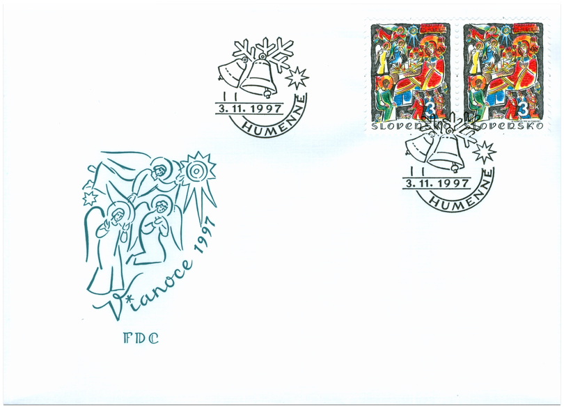Ministerstvo dopravy, pôšt a telekomunikácií SR vydalo dňa 3. 11. 1997 príležitostnú poštovú známku s vianočným motívom s nominálnou hodnotou 3 Sk. Na známke je zobrazené narodenie v Betleheme. Autorom výtvarných návrhov emisie je Mikuláš Klimčák, rytcom je Martin Činovský. Viacfarebnú známku s rozmermi obrazovej časti 23 x 30 mm (na výšku) vytlačila Poštovní tiskárna cenin, a.s., Praha technikou rotačnej oceľotlače v kombinácii s hĺbkotlačou na tlačových listoch po 50 známkach. Akademický maliar Mikuláš Klimčák - autor výtvarných návrhov emisie, sa narodil r.1921 v Humennom na východnom Slovensku. Študoval na oddelení kreslenia a maľovania na Slovenskej vysokej škole technickej v Bratislave...
