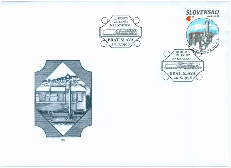 Ministerstvo dopravy, pôšt a telekomunikácií SR vydalo dňa 20. 8. 1998 tri príležitostné poštové známky série "150 rokov železníc na Slovensku" z emisného radu Technické pamiatky: parný rušeň - 4 Sk elektrický rušeň - 10 Sk motorový voz - 15 Sk Autorom výtvarných návrhov emisie je Dušan Grečner, rytcom je Martin Srb. Viacfarebné známky o rozmeroch obrazovej časti 23 x 30 mm (na výšku) vytlačila Poštovní tiskárna cenin Praha, a.s., technikou rotačnej oceľotlače v kombinácii s hĺbkotlačou na tlačových listoch po 50 známkach. Súčasne boli vydané 3 obálky prvého dňa vydania vrátane príležitostnej pečiatky s domicilom Bratislava. Na FDC známky parného...