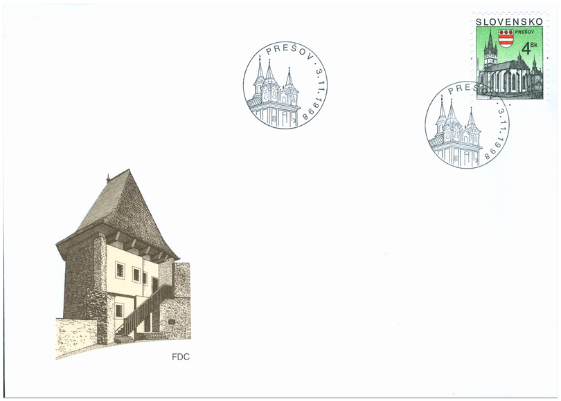 Ministerstvo dopravy, pôšt a telekomunikácií SR vydalo dňa 3. 11. 1998 bežnú výplatnú poštovú známku "Prešov " s nominálnou hodnotou 4 Sk. Na známke sú dominanty historického jadra mesta a mestský erb. Autorom výtvarných návrhov emisie a rytcom známky je Františk Horniak. Viacfarebnú známku o rozmeroch obrazovej časti 19 x 23 mm (na výšku) vytlačila Poštovní tiskárna cenin Praha, a.s., technikou rotačnej oceľotlače v kombinácii s hĺbkotlačou na tlačových listoch po 100 známkach . Súčasne bola vydaná obálka prvého dňa vydania vrátane príležitostnej pečiatky s domicilom Prešov. Autorom návrhu FDC s motívom historickej architektúry je František Horniak. FDC vytlačila tlačiareň Kníhtla...