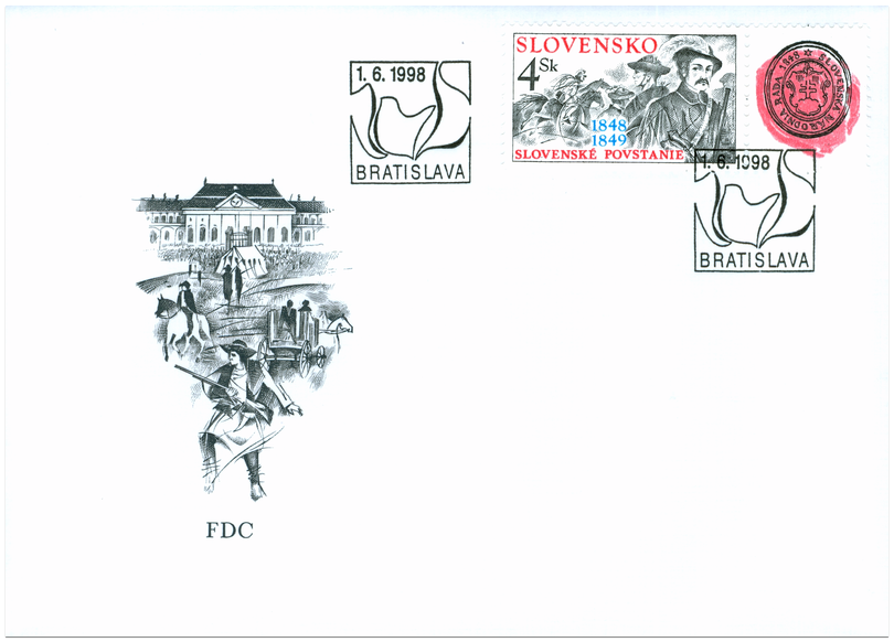 Ministerstvo dopravy, pôšt a telekomunikácií SR vydalo dňa 1. 6. 1998 príležitostnú poštovú známku "Slovenské povstanie 1848-49" s nominálnou hodnotou 4 Sk a s kupónom 150. výročia Slovenskej národnej rady. Na známke sú zobrazení slovenskí povstalci, na kupóne je historická pečať Slovenskej národnej rady. Autorom výtvarných návrhov emisie je Ivan Schurmann, rytcom je Miloš Ondráček. Viacfarebnú známku o rozmeroch obrazovej časti 23 x 40 mm (na šírku) a kupón rozmerov 19 x 23 mm ( na výšku) vytlačila Poštovní tiskárna cenin Praha, a.s., technikou rotačnej oceľotlače v kombinácii s hĺbkotlačou na tlačových listoch po 30 známkach a 40 kupónoch. Súčasne bola...