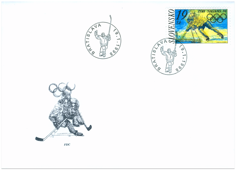 Ministerstvo dopravy, pôšt a telekomunikácií SR vydalo dňa 19. 1. 1998 príležitostnú poštovú známku " Zimné olympijské hry Nagano 1998 " s nominálnou hodnotou 19 Sk. Na známke okrem nápisov a symbolu olympijských hier je zobrazený hokejista v hre. Autorom výtvarných návrhov emisie je Igor Piačka, rytcom emisie je Bohumil Šneider. Viacfarebnú známku o rozmeroch obrazovej časti 40 x 23 mm (na šírku) vytlačila Poštovní tiskárna cenin, a.s., Praha technikou rotačnej oceľotlače v kombinácii s hĺbkotlačou na tlačových listoch po 50 známkach . Súčasne bola vydaná obálka prvého dňa vydania vrátane príležitostnej pečiatky s domicilom Bratislava. Na FDC je zobrazený výjav...