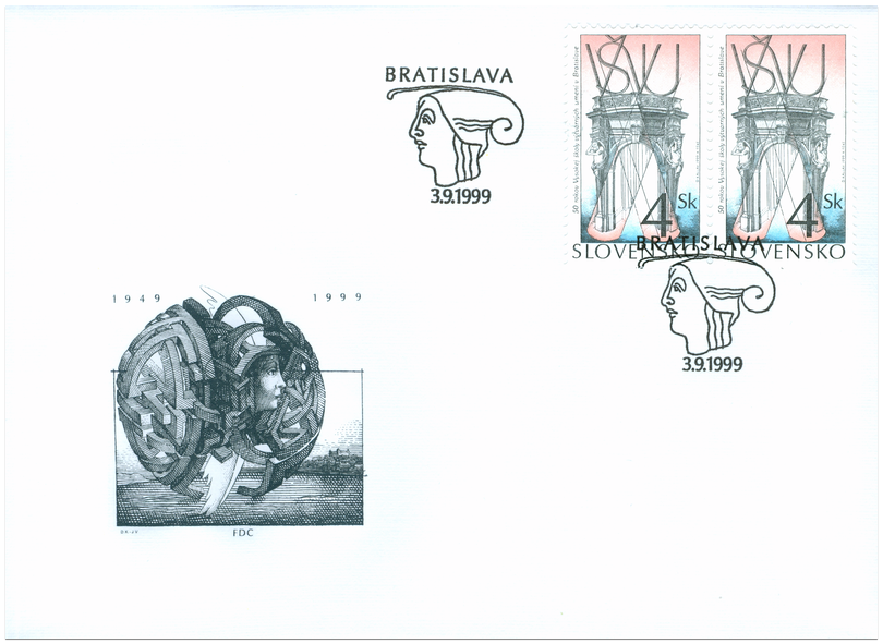 Ministerstvo dopravy, pôšt a telekomunikácií SR vydalo dňa 3. 9. 1999 príležitostnú poštovú známku "50 rokov Vysokej školy výtvarných usmení v Bratislave" s nominálnou hodnotou 4 Sk. Na známke je symbolická kresba a príslušný text. Autorom výtvarných návrhov emisie je akademický maliar prof. Dušan Kállay. Rytinu známky vytvoril Arnold Feke. Viacfarebnú známku o rozmeroch obrazovej časti 23 x 40 mm (na výšku) vytlačila Poštovní tiskárna cenin Praha, a.s., technikou rotačnej oceľotlače v kombinácii s hĺbkotlačou na tlačových listoch po 50 známkach. Súčasne bola vydaná obálka prvého dňa vydania vrátane príležitostnej pečiatky s domicilom Bratislava. Na FDC je symbolická kresba autora prof...
