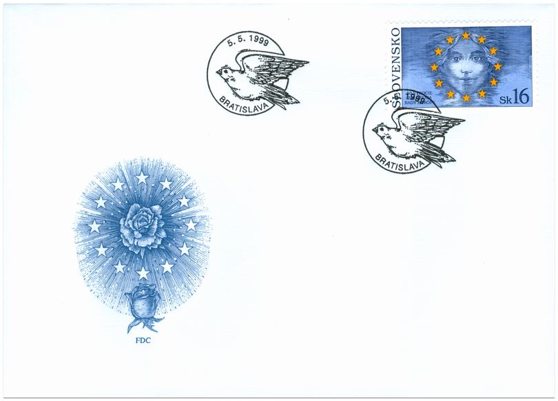 Ministerstvo dopravy, pôšt a telekomunikácií SR vydalo dňa 5. 5. 1999 príležitostnú poštovú známku "50. výročie Rady Európy" s nominálnou hodnotou 16 Sk. Časť nákladu je vytlačená ako samotné známky v priehradkovom liste obsahujúcom 10 ks známok, časť nákladu známky je vydaná v hárčekovej úprave. Na obidvoch tlačových úpravách je na známke o rozmeroch obrazovej časti 40 x 23 mm (na šírku) zhodná viacfarebná symbolická kresba spracovaná na motívy loga Rady Európy. Na hárčeku (formát cca 66 x 85 mm, na výšku) je logo Rady Európy v podobe vlajky. Autorom výtvarných návrhov emisie je akad. maliar Karol Felix. Rytiny vytvoril František...