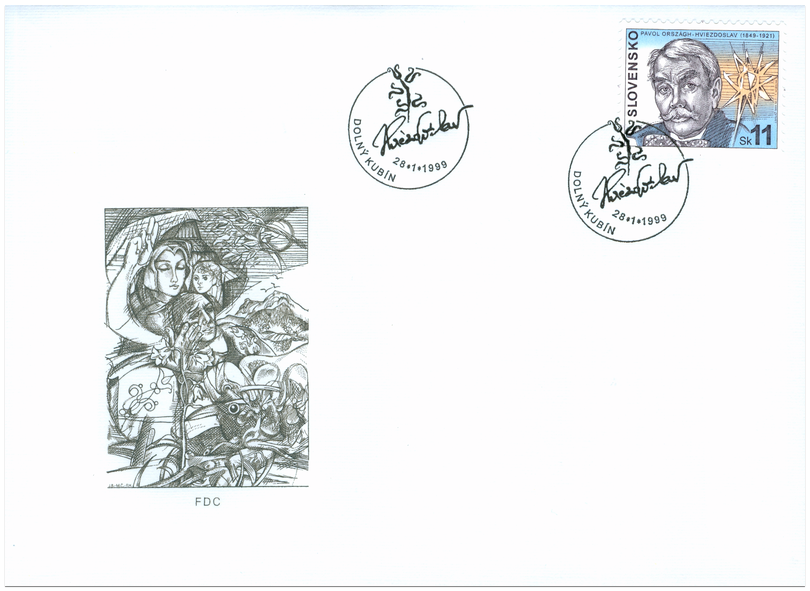 Ministerstvo dopravy, pôšt a telekomunikácií SR vydalo dňa 28. 1. 1999 príležitostnú poštovú známkú z emisného radu Osobnosti - P. O. Hviezdoslav v nominálnej hodnote 11 Sk. Na známke je vyobrazený portrét osobnosti a motívy dokresľujúce jej pôsobenie. Autorom výtvarných návrhov emisie (známky, motívu na FDC i pečiatky) je akad. maliar Jozef Baláž. Rytinu známky na základe líniovej rozkresby akad. maliara Martina Činovského vytvoril František Horniak. Viacfarebnú známku s rozmermi obrazovej časti 30 x 23 mm (na šírku) vytlačila Poštovní tiskárna cenin Praha, a.s., technikou rotačnej oceľotlače v kombinácii s hĺbkotlačou na tlačových listoch po 50 známok. Súčasne bola vydaná obálka...