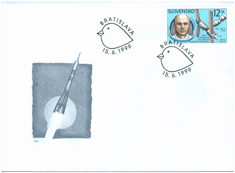 Ministerstvo dopravy, pôšt a telekomunikácií SR vydalo dňa 15. 6. 1999 príležitostnú poštovú známku "Prvý kozmický let občana SR" v hárčekovej úprave s nominálnou hodnotou 12 Sk. Na známke je portrét slovenského kozmonauta Ivana Bellu a časť orbitálnej stanice MIR, na hárčeku je kresba stanice MIR. Autorom výtvarných návrhov emisie je akad. maliar Dušan Nágel. Rytinu známky vytvoril akad. maliar Martin Činovský, rytinu hárčeka vytvoril František Horniak . Viacfarebný hárček rozmerov 70 x 85 mm (na výšku) so známkou o rozmeroch obrazovej časti 40 x 23 mm (na šírku) umiestnenú v hornej časti hárčeka vytlačila Poštovní tiskárna cenin Praha, a.s., technikou...