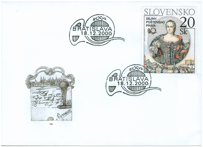 Ministerstvo dopravy, pôšt a telekomunikácií SR vydalo dňa 18. 12. 2000 príležitostnú poštovú známku "Dejiny poštového práva" s nominálnou hodnotou 20 Sk. Na známke je portrét Márie Terézie v korunovačnom odeve (výrez olejomaľby Daniela Schmidelyho), výrez z veduty Bratislavy, poštová trúbka a nápis Dejiny poštového práva. Na pripojenom kupóne je titulná strana poštového nariadenia Márie Terézie z roku 1748 a postavy poštárov v dobových uniformách. Autorom výtvarných návrhov emisie je akad. maliar Prof. Dušan Kállay. Rytiny emisie vytvoril akad. maliar Rudolf Cigánik. Viacfarebnú známku o rozmeroch obrazovej časti 40 x 50 mm (na výšku) a kupón s obrazovou časťou rozmerov 48...