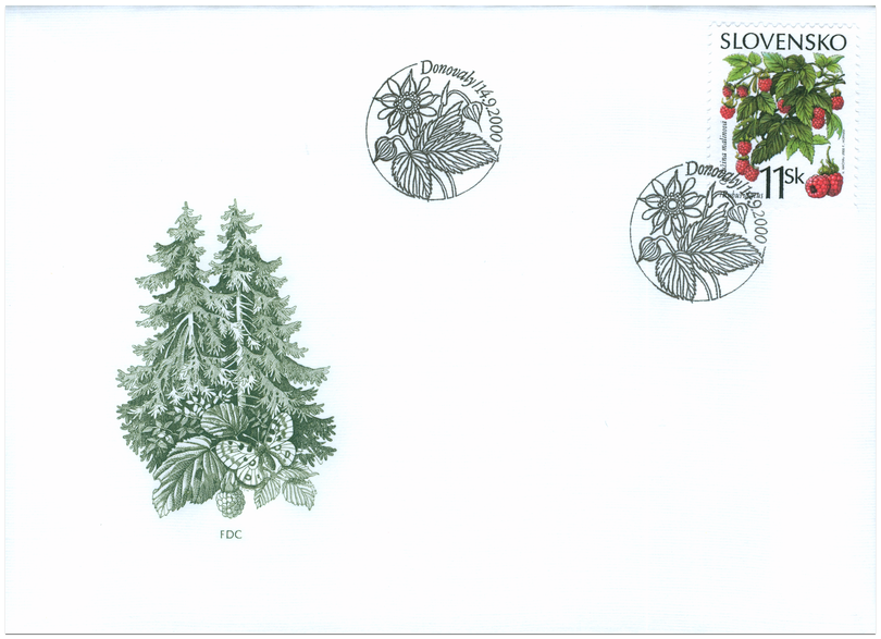 Ministerstvo dopravy, pôšt a telekomunikácií SR vydalo dňa 14. 9. 2000 tri príležitostné poštové známky série "Lesné plody" z emisného radu Ochrana prírody: malina (11 Sk), jahoda (13 Sk), čučoriedka (15 Sk) 3 známky s vyobrazením uvedených plodov a vedeckým názvoslovím v slovenskom a latinskom jazyku spolu s potlačeným kupónom sú vytlačené na spoločnom tlačovom liste. Na medzipoliach tlačového listu je zobrazená flóra lesa. Autorom výtvarných návrhov emisie je akad. maliar Vladimír Machaj. Rytiny známok a hárčeka vytvoril František Horniak. Viacfarebné známky o rozmeroch obrazovej časti 23 x 30 mm (na výšku) na hárčeku o rozmeroch 15,5 x 10,3 cm (na...