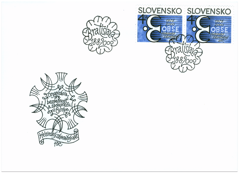 Ministerstvo dopravy, pôšt a telekomunikácií SR vydalo dňa 18. 8. 2000 príležitostnú poštovú známku s nominálnou hodnotou 4 Sk venovanú 25. výročiu Organizácie pre bezpečnosť a spoluprácu v Európe (OBSE). Na známke je štylizovaný symbol (holubica v tvare E) a nápisy: OBSE 1975-2000, Helsinský záverečný akt. Autorom výtvarných návrhov emisie je akad. maliar Miroslav Cipár. Rytiny vytvoril Martin Srb. Viacfarebnú známku o rozmeroch obrazovej časti 30 x 23 mm (na šírku) vytlačila Poštovní tiskárna cenin Praha, a.s., technikou rotačnej oceľotlače v kombinácii s hĺbkotlačou na tlačových listoch po 50 známkach. Súčasne bola vydaná obálka prvého dňa vydania vrátane príležitostnej pečiatky s...