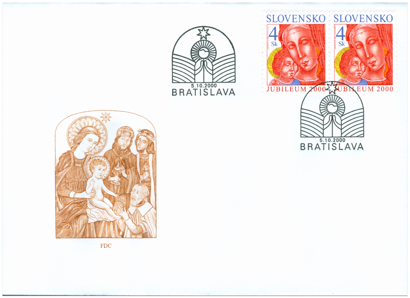 Ministerstvo dopravy, pôšt a telekomunikácií SR vydalo dňa 5. 10. 2000 príležitostnú poštovú známku "Vianoce Jubileum 2000" s nominálnou hodnotou 4 Sk. Na známke je zobrazená Madona s dieťaťom a text Jubileum 2000. Autorkou výtvarných návrhov emisie je akad. maliarka Katarína Ševellová-Šuteková. Rytinu známky vytvoril akad. maliar Martin Činovský. Viacfarebnú známku o rozmeroch obrazovej časti 23 x 30 mm (na výšku) vytlačila Poštovní tiskárna cenin Praha, a.s., technikou rotačnej oceľotlače v kombinácii s hĺbkotlačou na tlačových listoch po 50 známkach. Súčasne bola vydaná obálka prvého dňa vydania vrátane príležitostnej pečiatky s domicilom Bratislava. Na FDC je motív klaňania troch kráľov. Rytinu...