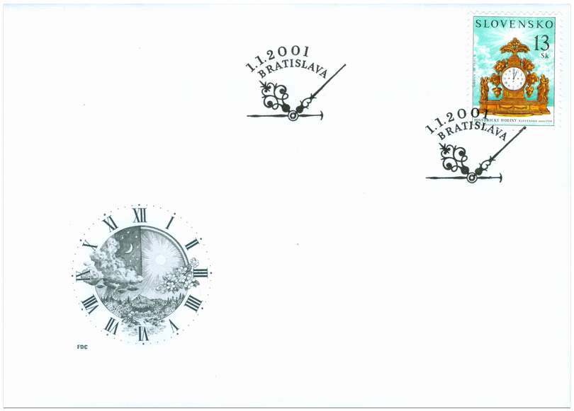 V novokoncipovanom emisnom rade Klenotnica múzeí, ktorý má predstaviť zaujímavé muzeálne exponáty zo slovenských múzeí, predstavujeme na začiatku nového tisícročia vzácne historické hodiny. Exponát zo zbierok Slovenského národného múzea v Bratislave figurálne klasicistické hodiny, zn. nečitateľné, Slovensko, okolo roku 1780, vyrezávané a zlátené drevo, hodinový stroj s kotvovým krokom a odbíjaním, rozmery: výška 65 cm, šírka 72 cm, na zadnej stene záznam o oprave - Hlohovec 1884. Na FDC sú symboly plynutia času: Slnko, Mesiac, hviezdna obloha a voda. Búrkové oblaky symbolizujú dramatické udalosti končiaceho sa tisícročia, Slnko, dúha a kvety zasa začiatok nového. Spolu so slovenskou krajinou ich autor zakomponoval...