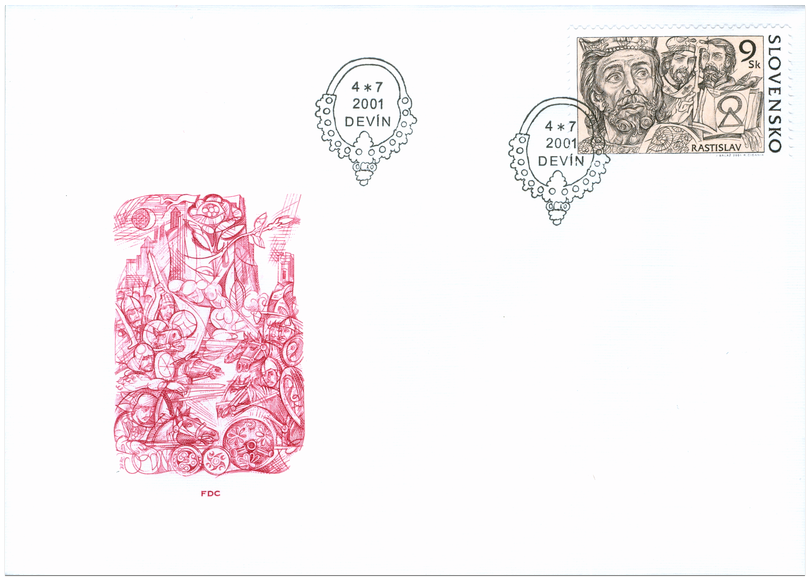 Osobnosti Veľkej Moravy - emisia v hárčekovej úprave. Na štyroch známkach, ktoré sú situované v dolnej častí hárčeka sú zobrazené portréty významných vládcov Vel'kej Moravy (začiatok 9. stor. - 906) - Pribinu, Rastislava, Koceľa, Svätopluka. Títo vládcovia Veľkej Moravy, pochádzajúci z Mojmírovskej kniežacej dynastie (833-906), sa pričinili o vznik, územný rozmach a kultúrny rozkvet prvého štátu západných Slovanov a sú zobrazení spolu s mapou Veľkej Moravy z čias jej najväčšieho rozkvetu. Mapa podľa spracovania akademika Jána Dekana je doplnená o reprodukciu archeologického nálezu - terčík so sokoliarom. Rastislav (okolo 820 -po r. 870) - vel'komoravské knieža v rokoch 846 -870. Vládu...