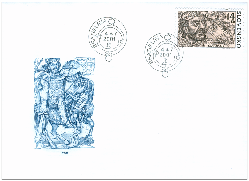 Osobnosti Veľkej Moravy - emisia v hárčekovej úprave. Na štyroch známkach, ktoré sú situované v dolnej častí hárčeka sú zobrazené portréty významných vládcov Vel'kej Moravy (začiatok 9. stor. - 906) - Pribinu, Rastislava, Koceľa, Svätopluka. Títo vládcovia Veľkej Moravy, pochádzajúci z Mojmírovskej kniežacej dynastie (833-906), sa pričinili o vznik, územný rozmach a kultúrny rozkvet prvého štátu západných Slovanov a sú zobrazení spolu s mapou Veľkej Moravy z čias jej najväčšieho rozkvetu. Mapa podľa spracovania akademika Jána Dekana je doplnená o reprodukciu archeologického nálezu - terčík so sokoliarom. Svätopluk ( okolo 840 - 894) - veľkomoravské knieža 871 - 94, najmocnejší veľkomoravský...