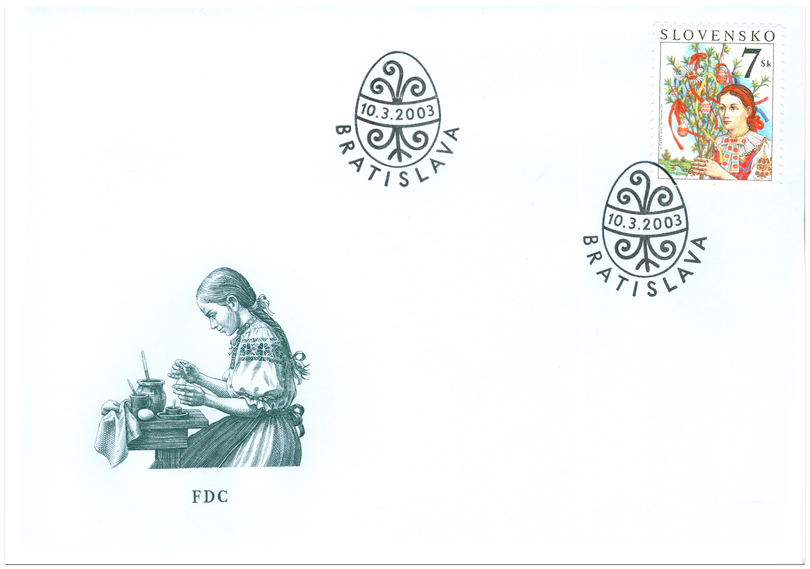 S týždňom pred Veľkou nocou sa na Slovensku i v prvej polovici 20. storočia spájajú zvyky siahajúce až do predkresťanského obdobia. Bohatá na obrady spojené s vítaním jari bola vždy najmä Kvetná nedeľa so symbolickým vynášaním zimy a donášaním leta. Na západnom Slovensku na Kvetnú nedeľu nosili dievčatá a deti so spevom a vinšami po dedine ozdobené zelené ratolesti pomenované „lesola“, „leto“ alebo „májik“, symbolizujúce nový rozkvet prírody na jar. Tento zvyk patrí do jarného zvykoslovného cyklu. Na známke je dievča vo vajnorskom kroji v ruke s lesolou – zelenou ratolesťou ozdobenou kraslicami a farebnými stuhami. Zdobená bývala i papierovými a...