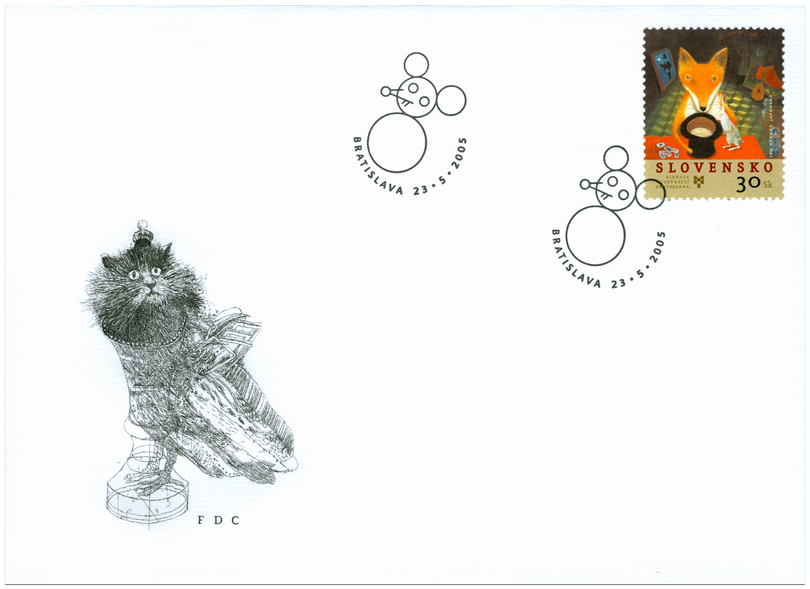 © Slovenská pošta, a..s., 2005 Bienále ilustrácií Bratislava (BIB) je medzinárodná súťažná výstava originálov ilustrácií detských kníh. Dielo reprodukované na známke je knižná ilustrácia, ktorú medzinárodná porota ocenila na BIB 2003. Na tomto bienále sa celkovo predstavilo 311 ilustrátorov z 38 krajín, pričom Grand Prix BIB 2003 získala Iku Dekune z Japonska. Jej ilustrácia však neprezentuje typické znaky japonskej ilustračnej kultúry. Ilustrácie tejto umelkyne nesú znaky európskej ilustrácie a autorka nezaprie ani skutočnosť, že bola žiačkou profesora Dušana Kállaya. Kállayov vplyv na jej tvorbu je evidentný v chápaní ilustrácie, v poetike, vo fantazijných polohách a vo vyprofilovanom zmysle pre jemný, nenápadný...