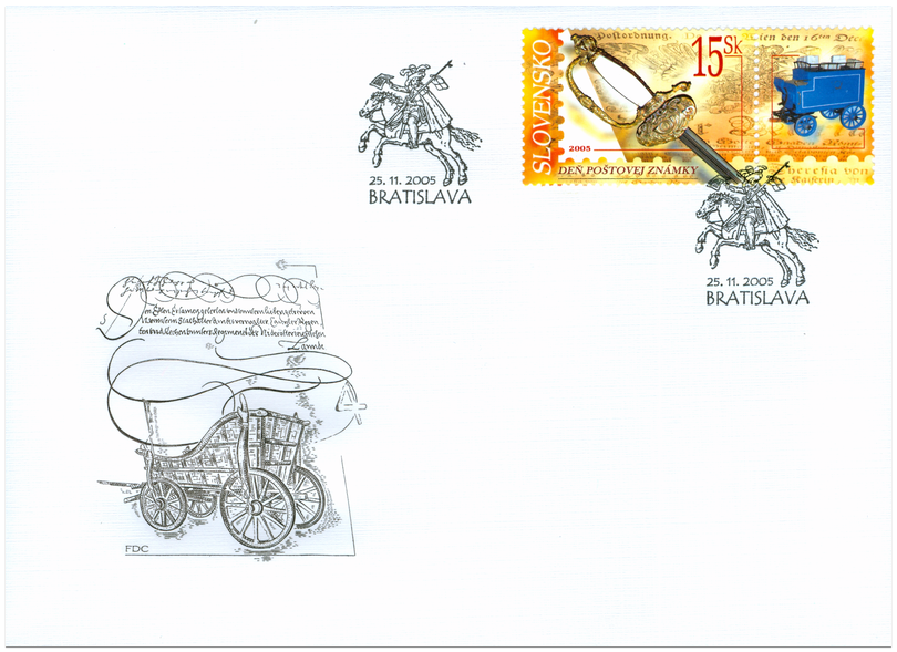 © Slovenská pošta, a.s., 2005 Rovnošatu v poštovej službe používali všetci zamestnanci, zvlášť vyšší úradnici a poštmajstri nosili nádherné a bohato zdobené "gala" uniformy z veľmi kvalitného súkna. Podobu rovnošaty pre úradníkov a ďalších poštových zamestnancov podrobne opisuje Dekrét dvorskej komory vo Viedni z roku 1815. Podľa uvedeného dekrétu rovnošatu doplňoval pozláteny kord. Dochované uniformy, ale i ich doplnky v podobe nevyhnutnej poštovej trúbky, ako aj modely poštových dopravných prostriedkov minulosti patria medzi vzácne zbierky Poštového múzea, ako doklad dejín pošty a poštovníctva na Slovensku. Kord je zaujímavým dokladom, aký dôležitý význam mala rovnošata v posudzovaní spoločenského a sociálneho postavenia zamestnanca...