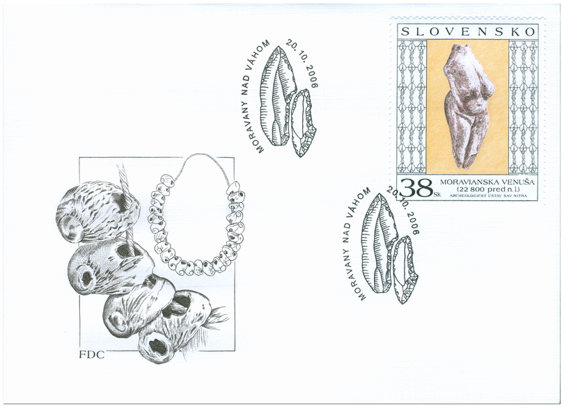 © Slovenská pošta, a .s., 2006 Najstaršie doklady umeleckého prejavu z územia Slovenska pochádzajú z obdobia mladšieho úseku staršej doby kamennej – paleolitu. Zastúpené sú najmä drobné predmety ako amulety, závesky a koráliky. Predstavujú samostatný druh umelecko-úžitkových predmetov. Výnimočným výtvarným prejavom je nález sošky ženy so zvýraznením pohlavných znakov. Moraviansku venušu z mamutoviny vyrezal okolo roku 22 800 pred n. l., na základe datovania C14, človek dnešného typu. Na úkor iných častí tela sa snažil, aby vynikli symboly predstavujúce zachovanie ľudského rodu. Žena, ako symbol darkyne života, mala v tomto období významné postavenie v spoločnosti. A práve zvýraznenie ženských atribútov sa...