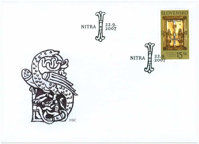 © Slovenská pošta, a .s., 2007 Nitriansky evanjeliár sa považoval za najstaršiu zachovanú knihu vyhotovenú na Slovensku, a to pred rokom 1083. Ide o liturgickú knihu, obsahujúcu výňatky z evanjelií, čítané počas nediel a sviatkov cirkevného roka. Z pôvodných 54 pergamenových fólií s rozmermi 285x195 mm sa zachovalo 50. Fólie sú zviazané a vložené do hrubých drevených dosiek, obtiahnutých tmavočerveným zamatom. Na prednú dosku bol v 14. až 15. storočí pripevnený hlboký strieborný pozlátený reliéf, ktorý zobrazuje aj prezentovaná poštová známka. Reliéf znázorňuje ukrižovanie Krista s postavami Panny Márie a sv. Jána stojacimi na podstavcoch. Na kríž v dolnej časti nadväzuje...