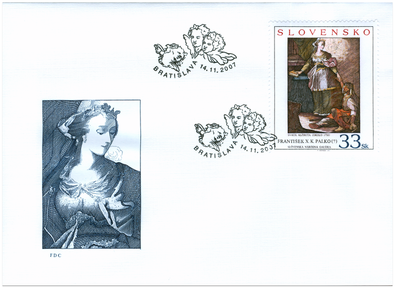 © Slovenská pošta, a .s., 2007 Umenie baroka bolo aj na našom dnešnom území v mnohom úzko previazané s opätovným rozkvetom kultu svätých. Potridentská ikonografia priniesla so sebou novokanonizovaných svätcov a cielene oživovala celú plejádu najrôznejších stredovekých svätých patrónov a ochrancov. Medzi nich sa radí aj v Bratislave narodená dcéra uhorského kráľa Ondreja II. Alžbeta Uhorská (* 1207). Označovaná tiež býva aj ako Alžbeta Durínska, podľa svojho manžela durínskeho grófa Ľudovíta IV. Po jeho smrti v roku 1227 sa vzdala majetku a dobrovoľne žila v chudobe vo františkánskom kláštore v Marburgu, kde sa venovala opatere chorých. Tam aj v novembri 1231...