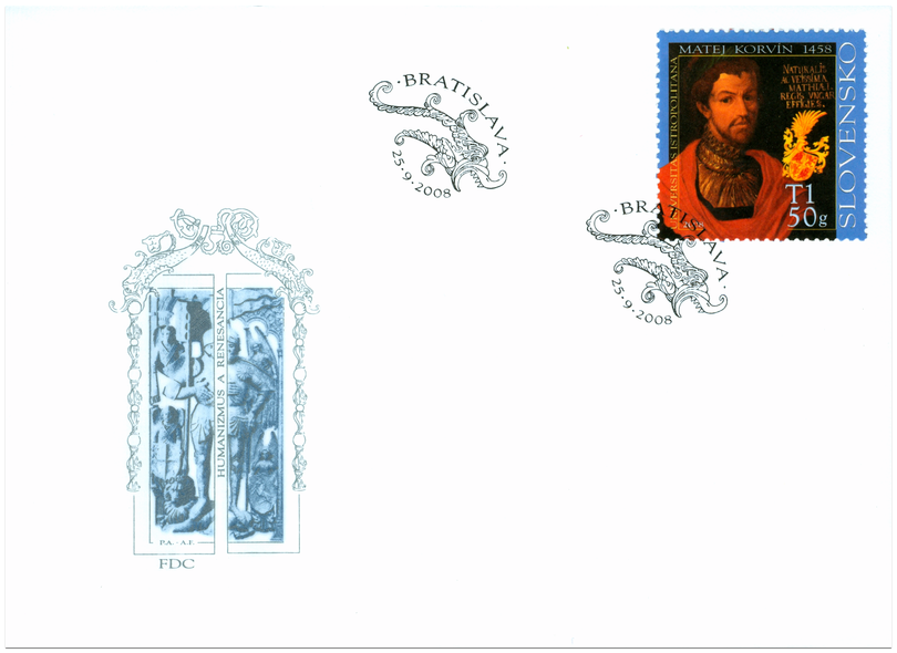 Označenie T1 50g zodpovedá tarife pre list 1. triedy do 50 g v tuzemskom styku. © Slovenská pošta, a . s., 2008 V roku 2008 si Slovenská pošta, a.s. pripomína 550 výročie korunovania Mateja Korvína (* 23. 2. 1443, † 6. 4. 1490) uhorským kráľom v roku 1458. Práve na žiadosť tohto panovníka bola v roku 1465 v Bratislave založená prvá univerzita na území Slovenska Universitas Istropolitana, ktorej dodnes stojaca budova postavená v neskorogotickom štýle je sídlom Vysokej školy múzických umení. Matej bol synom uhorského guvernéra Jána Huňadyho a epitetum Corvinus mu pridelil jeho životopisec, renesančný vzdelanec pôsobiaci na jeho...