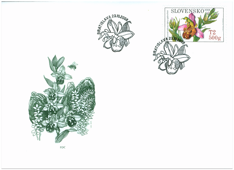 Označenie T2 500g zodpovedá tarife pre list 2. triedy do 500 g v tuzemskom styku. © Slovenská pošta, a . s., 2008 Rod Ophrys zahŕňa okolo 70 druhov, ktoré sú rozšírené prevažne v oblasti Stredomoria, odkiaľ zasahujú aj do juhozápadnej Ázie. Na území Slovenska je tento rod zastúpený 5 druhmi, ktoré patria medzi najvzácnejšie druhy orchidejí. Rastlina má guľovité hľuzy z ktorých vyrastá prezimujúca prízemná ružica sivozelených kopijovitých listov. V júni až v júli sa začnú vo vrcholovej časti stonky objavovať nápadné kvety, ktorých môže byť 3 až 10. Kvitnúca rastlina sa stala aj námetom pre emisiu známky. Zaujímavé je, že...