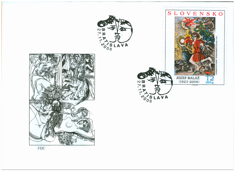 Označenie T2 1000g zodpovedá tarife pre list 2. triedy do 1000 g v tuzemskom styku. © Slovenská pošta, a. s., 2008 Jozef Baláž (14. 3. 1923 – 6. 7. 2006) akademický maliar, grafik, ilustrátor, nestor slovenskej známkovej tvorby, zaslúžilý umelec, významná osobnosť slovenského umeleckého a kultúrneho života. Odchovanec osobností slovenského výtvarného umenia Jána Mudrocha, Gustáva Mallého, Jozefa Kostku, Kolomana Sokola a Dezidera Millyho ukončil v roku 1954 štúdiá na Akadémii výtvarných umení v Sofii u profesora Ilju Beškova. Vyzretým umeleckým prejavom vstúpil do výtvarného diania. Stal sa členom tvorivých skupín Život a Klub grafikov. Bol Čestným členom Zväzu bulharských výtvarných umelcov...