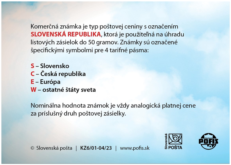 S – Slovensko, C – Česká republika, E – Európa, W – ostatné štáty sveta, pričom ich nominálna hodnota je vždy analogická platnej cene za príslušný druh poštovej zásielky.