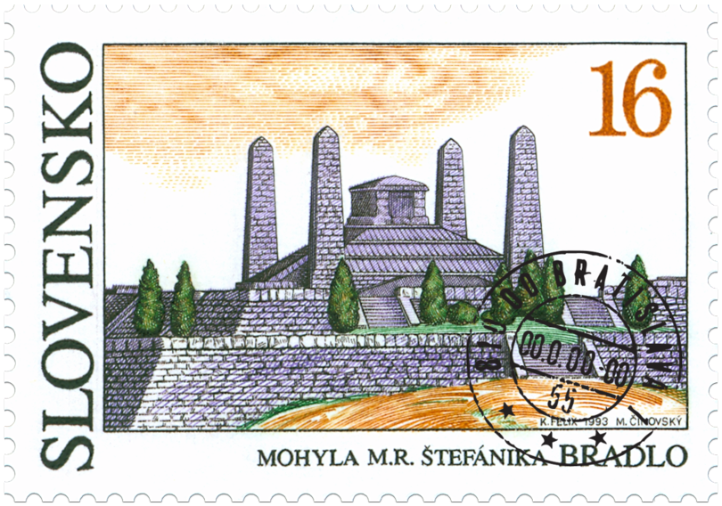 Ministerstvo dopravy, spojov a verejných prác Slovenskej republiky vydalo dňa 17. 12. 1993 príležitostnú poštovú známku "Mohyla M. R. Štefánika Bradlo" v nominálnej hodnote 16 Sk. Viacfarebná známka rozmerov obrazovej časti 40 x 26 mm je vytlačená na poštovom hárčeku rozmerov 70 x 90 mm. Na známke je stavba mohyly realizovaná podľa projektu architekta Dušana Jurkoviča. V dolnej časti hárčeka je zobrazený pohľad na krajinu. Autorom výtvarných návrhov emisie je akad. maliar Karol Felix. Rytcom známky je akad. maliar Martin Činovský. Sprievodný motív na hárčeku vyryl František Horniak. Hárček vytlačila PTC, a. s. Praha oceľotlačou z plochých platní. Známka platí v...