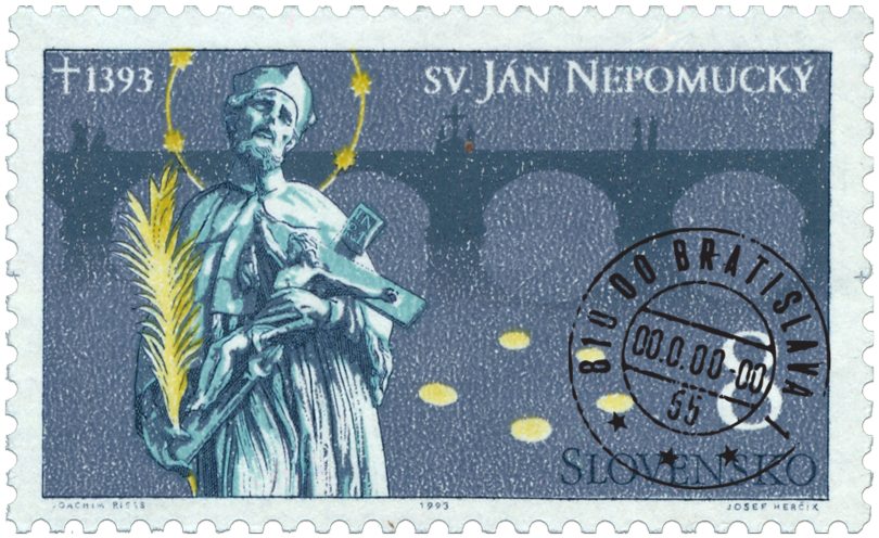 Ministerstvo dopravy, spojov a verejných prác vydalo dňa 11.3.1993 spoločne s Českou republikou a Spolkovou republikou Nemecko príležitostnú poštovú známku " Svätý Ján Nepomucký". Známka s rovnakým kresbovým motívom vznikla na podklade výtvarného návrhu nemeckého grafika Joachima Riessa. Spoločné vydanie sa bude líšiť iba hodnotou (ČR 8 Kč, SR 8, SRN 100), jazykovými mutáciami textu a technikou tlače. Známka obsahuje vo výtvarnej kompozícii s pohľadom na Karlov most v Prahe detail sochy sv. Jána Nepomuckého vytvorené na základe kresby J.B. Matheya a škicu viedeňského sochára M. Rauchmullera podľa dreveného modelu J. Brokofa, odliata bola J.W. Heroldtom z bronzu v Norimberku v...