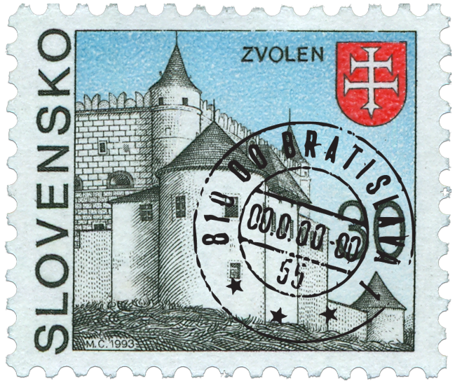 Ministerstvo dopravy, spojov a verejných prác Slovenskej republiky vydalo dňa 24. 9. 1993 výplatnú poštovú známku "Zvolen" s nominálnou hodnotou 30 Sk. Známka s motívom Zvolenského zámku a erbom mesta Zvolen bola vydaná v roku 750. výročia udelenia obnovenia mestských práv. Autorom výtvarného návrhu, ryteckej rozkresby a rytiny je akad. maliar Martin Činovský Známku rozmerov 23 x 19 mm na šírku vytlačila Poštová tlačiareň cenín, Praha, a. s. rotačnou oceľotlačou v kombinácii s hĺbkotlačou na tlačových listoch po 100 ks. Známka platí v tuzemskom a medzinárodnom styku od 24. 9. 1993 až do odvolania. Zvolen leží vo Zvolenskej kotline pri sútoku...