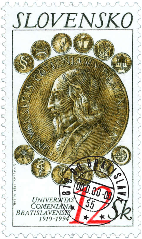 Ministerstvo dopravy, spojov a verejných prác vydalo dňa 18.10.1994 príležitostnú poštovú známku "75 rokov Univerzity Komenského" v nominálnej hodnote 12 Sk. Dvojfarebná známka (zlatistá a čierna farba) s vyobrazením averzu univerzitnej medaily (autor O. Španiel), symbolmi jednotlivých fakúlt a latinskými nápismi je dielom akad. maliara Dušana Kállaya. Rytinu známky vytvoril Martin Srb. Známku rozmerov obrazovej časti 23 x 40 mm (na výšku) vytlačila Poštovní tiskárna cenin, a.s., Praha technikou rotačnej oceľotlače v kombinácii s hĺbkotlačou na tlačových listoch po 50 ks v náklade 2 000 000 ks. Základ založenia Univerzity Komenského v Bratislave vytvorilo v roku 1919 Národné zhromaždenie ČSR. V...