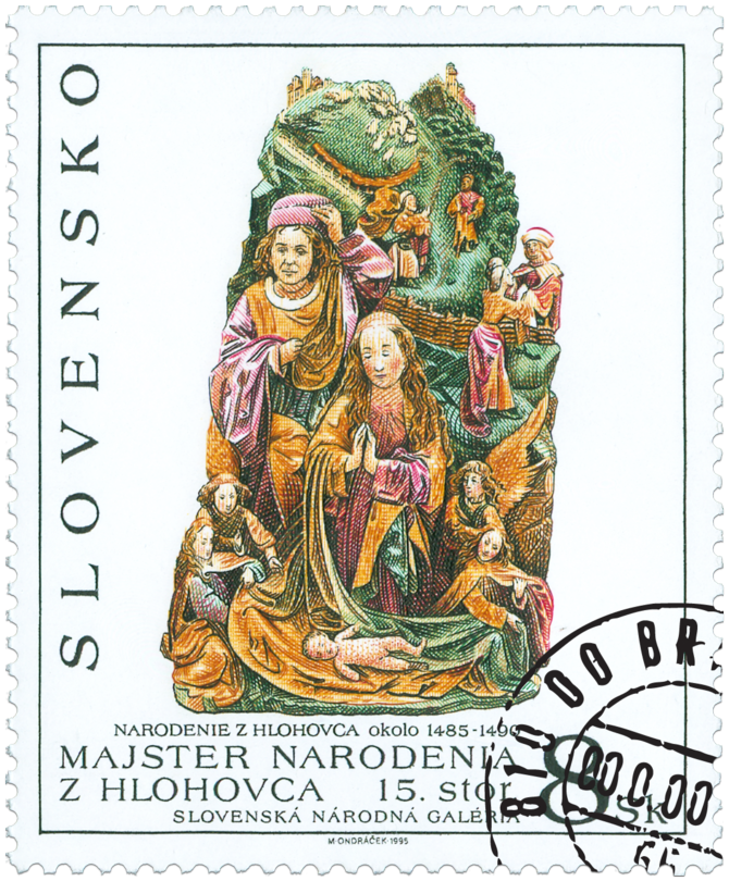 Ministerstvo dopravy, pôšt a telekomunikácií vydalo dňa 30. 11. 1995 príležitostnú poštovú známku "Narodenie z Hlohovca", zo série Umenie, o nominálnej hodnote 8 Sk. Na známke pod reprodukciou diela okrem nominálnej hodnoty sú texty: Majster Narodenia z Hlohovca, 15. stor., Narodenie z Hlohovca, okolo 1485-1490, Slovenská národná galéria. Podľa štylistických znakov patrí reliéf Narodenie z Hlohovca do okruhu hornorýnsky orientovaného sochárstva. Predstavuje typ Adorácie narodenia Ježiška, v ktorom Panna Mária kľačí pred dieťatkom so zloženými rukami. Dieťa leží na cípe plášťa pridržiavanom anjelmi. Kompozícia dodržiava stredovekú hierarchiu jednotlivých postáv. Z umeleckého hľadiska sa vyznačuje elegantnou a kultivovanou formou a lyricky precíteným...