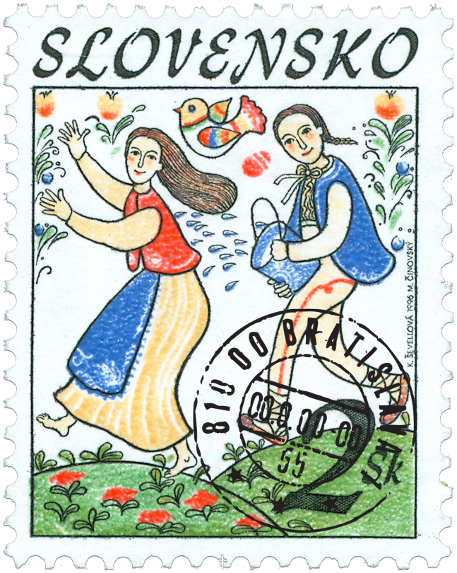 Ministerstvo dopravy, pôšt a telekomunikácií vydalo dňa 15.3.1996 príležitostnú poštovú známku "Ľudové zvyky" s veľkonočným námetom o nominálnej hodnote 2 Sk. Viacfarebná známka zobrazuje veľkonočnú oblievačku (2 postavy v kroji a ornamentálne motívy). Ľudové zvyky - Veľká noc. Mimoriadne bohaté na jarné zvykoslovné prejavy boli už nedele pred Veľkou nocou (Smrtná a Kvetná nedeľa). Viažu sa k ním najzávažnejšie zvyky jarného zvykoslovia - symbolické vynášanie zimy a donášanie leta. Zvlášť zaujímavý je obrad vynášania zimy (zobrazený na FDC). Zimu symbolizovala slamená figurína oblečená do ženských šiat - Morena, Smrť, Kyselica. Mládež ju nosila so spevom po dedine a nakoniec ju hodili...